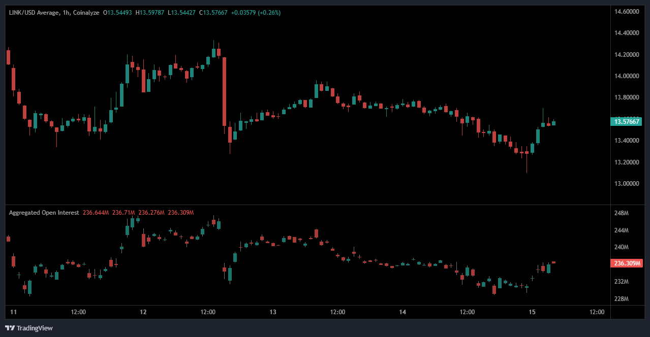 The LINK chart of 24 hours depicts the short-term weakness and a slight recovery after that, the price being approximately at $13.57, which is down by about 1% on the day.