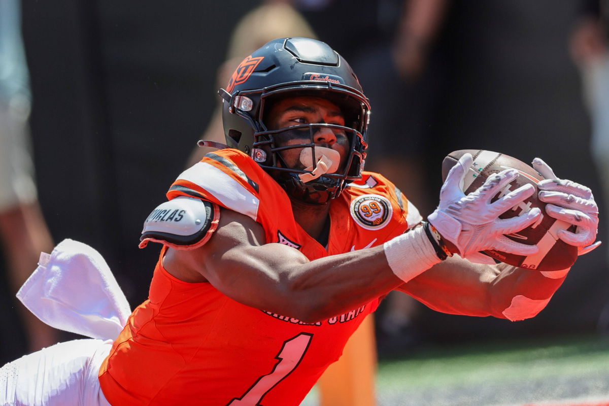 NCAA, College League, USA Football 2024: Arkansas vs Oklahoma State Sep 7 September 7, 2024: Cowboys receiver DeZhaun Stribling 1 dives for a ball thrown out in front of him. Oklahoma State defeated Arkansas 39-31 in double overtime in Stillwater, OK. Richey Miller/CSMCredit Image: Richey Miller/Cal Media Stillwater Ok USA EDITORIAL USE ONLY Copyright: xx ZUMA-20240907_faf_cm9_040.jpg RicheyxMillerx csmphotothree291435