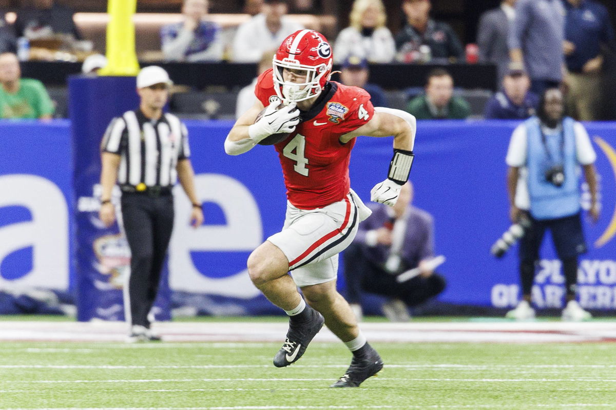 NCAA, College League, USA Football 2025: College Football Playoff Quarterfinal Allstate Sugar Bowl Notre Dame vs Georgia JAN 02 January 02, 2025: Georgia tight end Oscar Delp 4 runs with the ball after the cafch during NCAA football game action between the Notre Dame Fighting Irish and the Georgia Bulldogs at Caesars Superdome in New Orleans, Louisiana. John Mersits/CSM. Credit Image: Â John Mersits/Cal Media EDITORIAL USE ONLY Copyright: xx ZUMA-20250102_zma_c04_116.jpg JohnxMersitsx csmphotothree340004