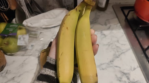 Two very ripe bananas, indicated by brown spots on the peel.Bananas at this stage are soft, have brown spots and emit a strong aroma.